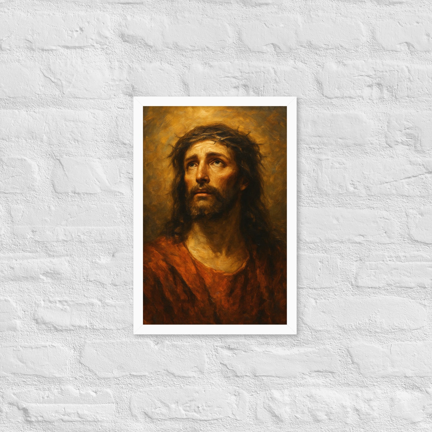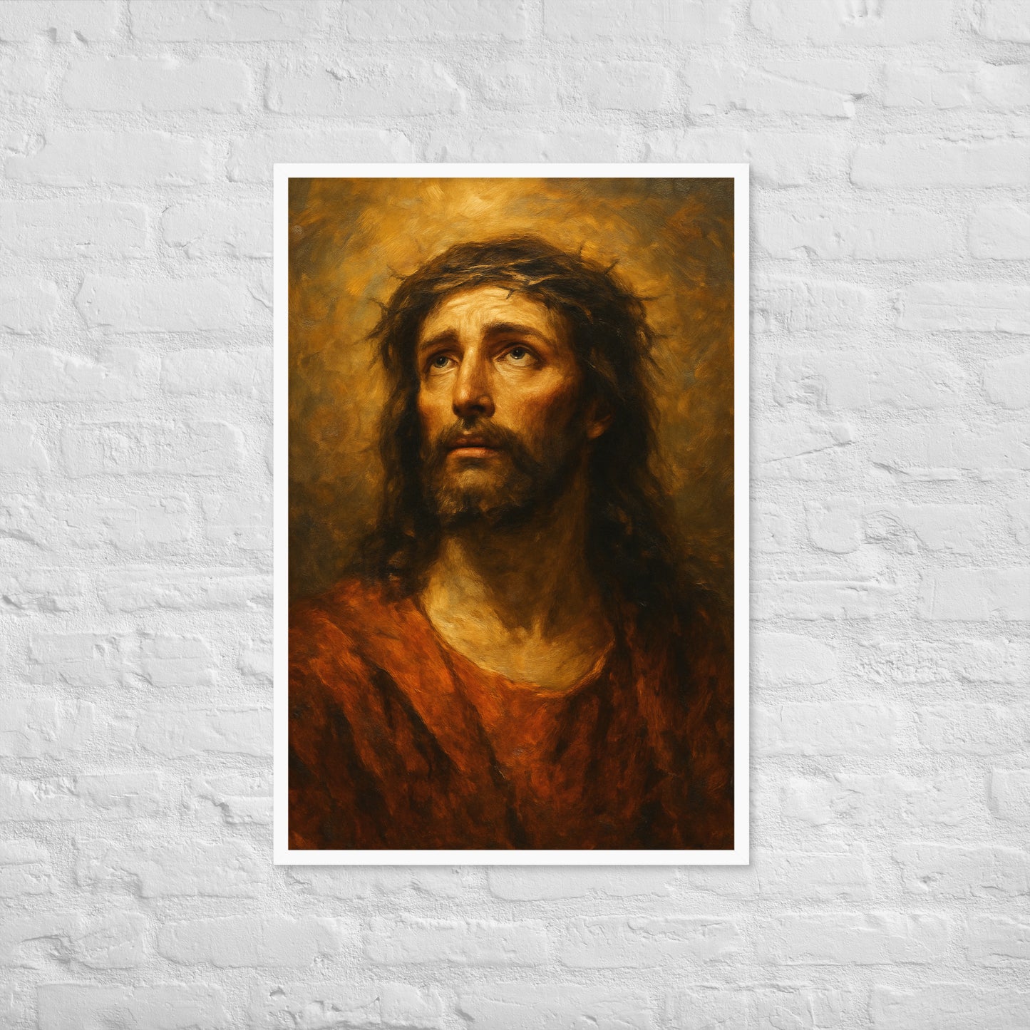 “Crown of Mercy” is a deeply moving oil-style portrait of Jesus Christ, captured in a moment of solemn reflection and divine grace. His eyes gaze upward, filled with compassion, strength, and quiet sorrow—evoking the profound humanity and holiness at the heart of the Christian faith. The warm, textured brushwork and soft, radiant light surrounding His face bring an intimate, timeless quality to this sacred image.